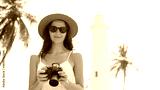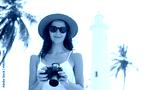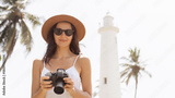 Happy Female Traveler With Camera At Galle Lighthouse Sri Lanka
