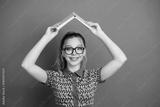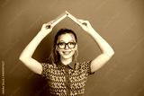 Young student girl with glasses holds a book over her head like a roof smiles against a violet background
