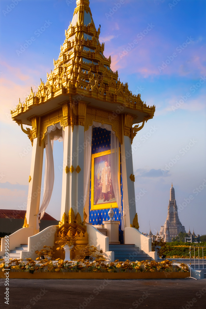 The replica of royal crematorium of His Majesty late King Bhumibol Adulyadej built for the royal funeral at Nakaphirom Park on the opposite side of Wat Arun Temple
