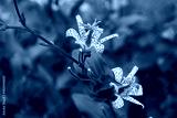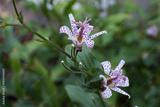 Japanese toad lily Tricyrtis hirta two blossoms, space for text, horizontal aspect