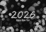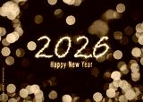Happy New Year 2026 greeting card with bokeh lights on dark background