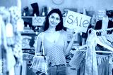 Armenian woman in a knitted summer top stands in a clothing store with a yellow poster about the start of sales