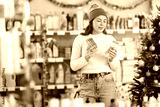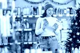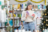 Uncertain young female customer choosing razor in large retail store with New Year decoration