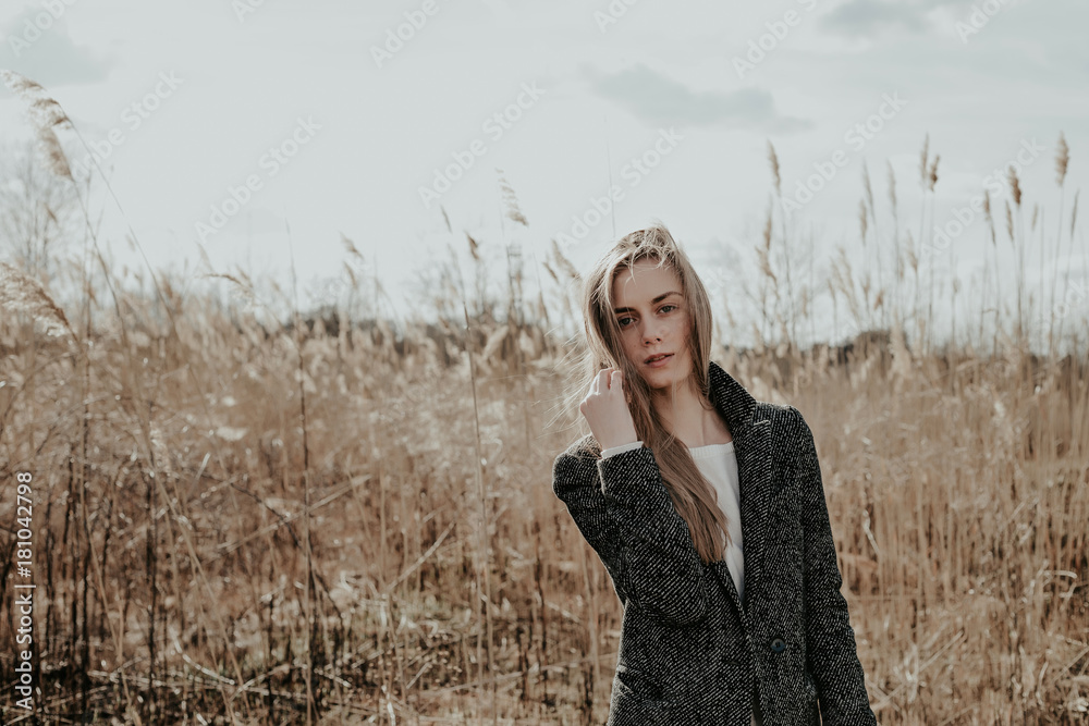 Woman looking at camera and touching to her hair. Girl with cute face, wide eyebrows and blonde hair posing outdoor. Background bulrush. Outdoor. Medium shot. Copy space.