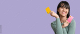 Beautiful young woman with credit cards on lilac background
