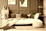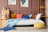 Comfortable bed and shelving units near brown wall in interior of children's room
