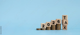 Wooden blocks showing 2026 and TAX on stacked coins represent future taxation, financial planning and economic policy. Ideal for Concepts of budget, savings, government tax and money management.