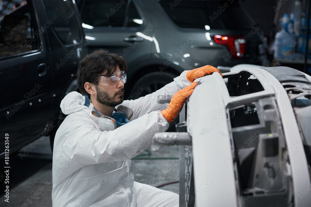 An automotive technician is repairing a car bumper in a workshop while wearing safety gear