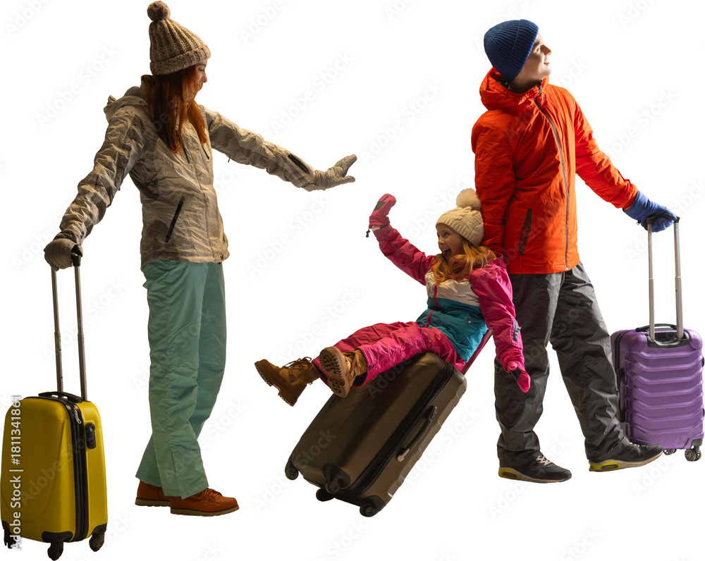 Child sliding playfully on suitcase while parents travel in winter outfits on transparent background. Concept of fun family visuals, creative travel promotion, mobility assets.