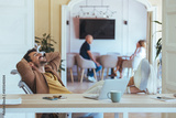 Relaxed Businessman At Modern Office Desk With Laptop And Colleagues In Background