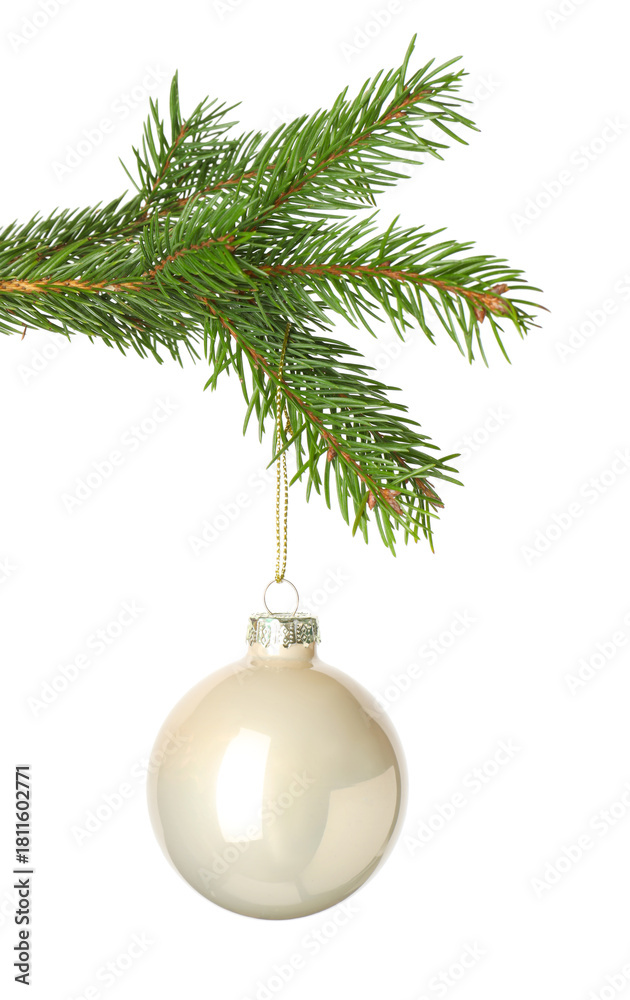 Shiny Christmas ball hanging on fir tree branch isolated on white
