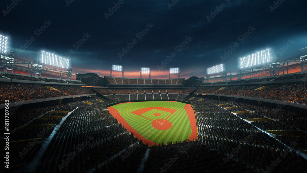 Night illuminated 3D rendered baseball arena with full stands and intense match ambience. Concept of high-energy fan emotion, commercial sports ads, and powerful stadium background.