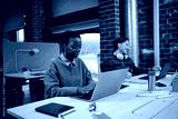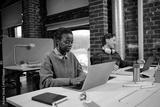 Black young adult woman working on laptop at modern business office desk, while Caucasian young adult man sitting in background using laptop with headphones around neck
