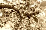 Plum tree branch on tree in orchard with lot of fruit on bright light