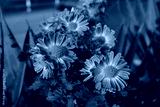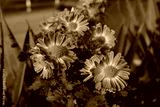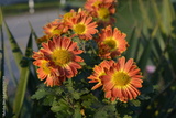 Landscape of warm autumn weather with outdoor flowers growing in a home garden. Bright, fluffy yellow, orange, red and brown chrysanthemum flowers with green leaves illuminated by warm autumn sun.