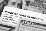 Proof of auto insurance card and many hundred dollar bills. Concept of insurance policy and car accident