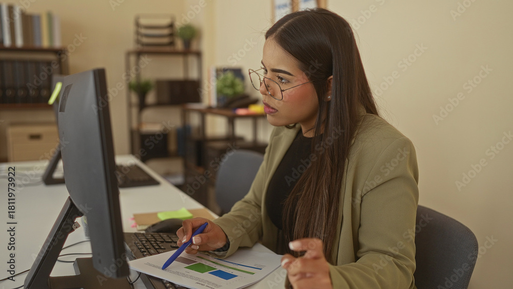 Woman working at a computer in an office, analyzing documents with visible focus in a modern workplace setting.