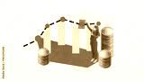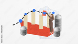 Minimal collage. Businesswoman adjusting a tall bar chart positioned between large coin stacks. Concept of corporate strategy, economic correction, challenge management and emotional decision-making.