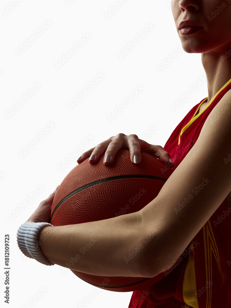 Closeup female athlete holding basketball with calm confidence. Concept of emotional focus, balance, and discipline in health, coaching, and sports communication design.