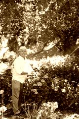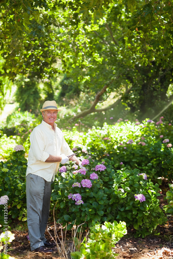 Senior man tending hydrangea bushes in shaded garden with straw hat and white gloves, copy space
