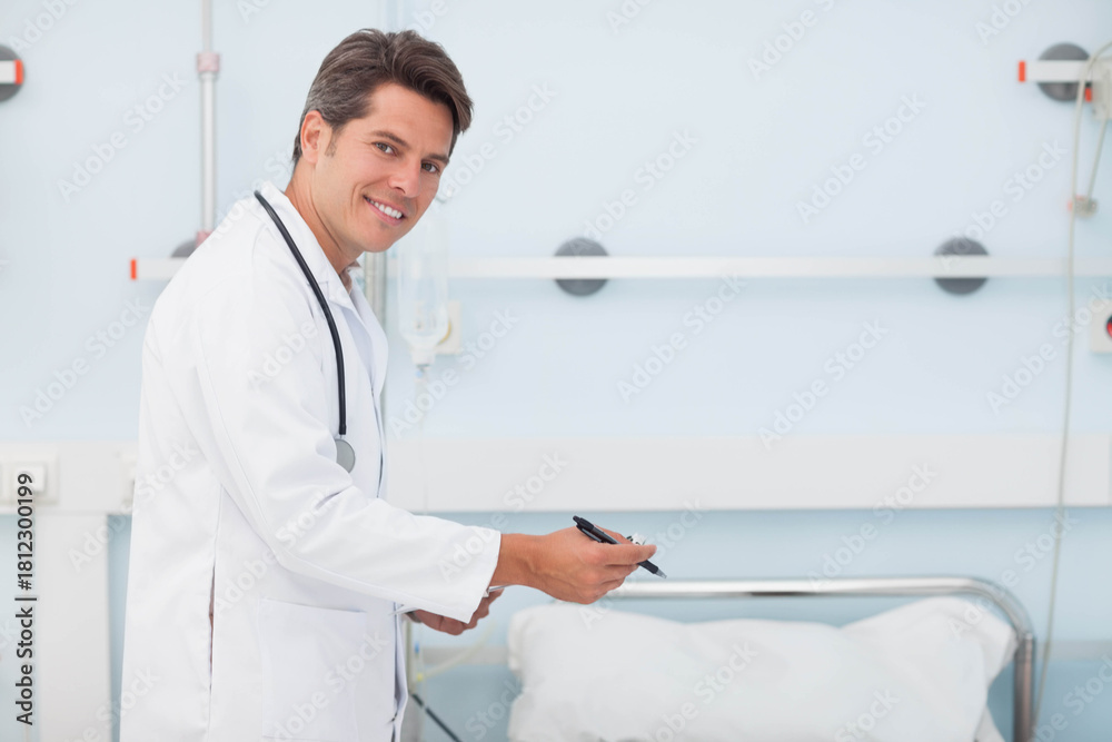 Male doctor standing left of ward bed wearing lab coat stethoscope holding chart, copy space