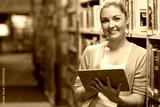 Woman standing and leaning against bookshelf, holding tablet in pink cardigan in library aisle
