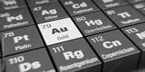 Detail view of the chemical element Au Gold with the atomic number 79 within the periodic table of elements in German. Dynamic dispersion effect at the corners and shallow depth of field.