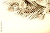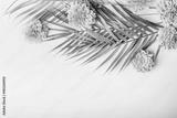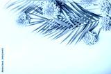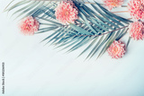 Creative layout with tropical palm leaves and pastel pink flowers on light turquoise blue desktop background, top view, place for text, horizontal