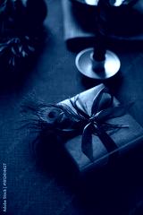 Christmas celebration table settings with gift box with peacock feather on the green linen cloth. Close up