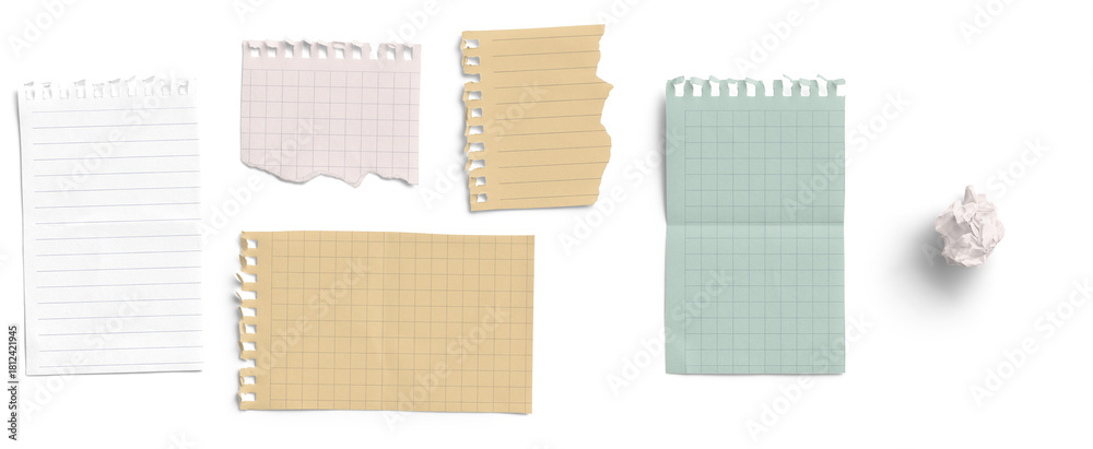 Assorted Torn Note Pages and Crumpled Paper Ball