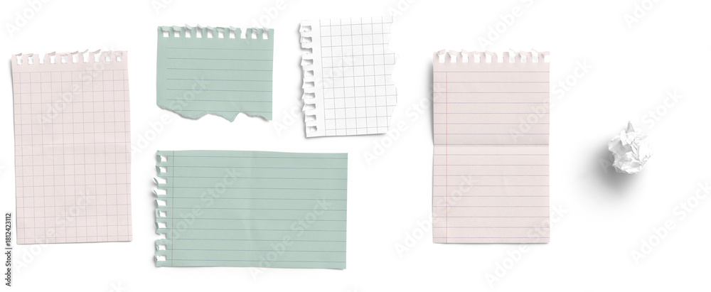 Torn Pastel Note Papers and Crumpled Scrap on White