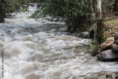 Flooded river in the Great Smoky Mountains in fall, horizontal aspect