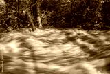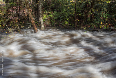 Long shadows over rushing flood waters in the Great Smoky Mountains, space for text, horizontal aspect