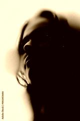Beautiful young woman sensual portrait. Model illuminated with back light and visible silhouettes. Black and white image. Grunge, noise and motion blur effect applied. Retro vintage, gothic style