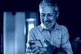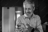 Mature man smiling at smartphone with earbuds at home