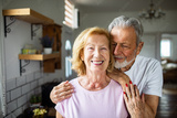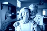 Senior husband and wife smiling and embracing at home kitchen