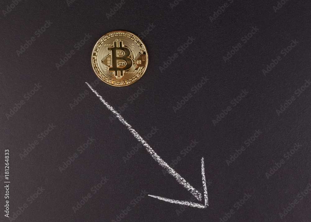 Bitcoin sign with arrow down. Concept of cryptocurrency lesion and fall of.