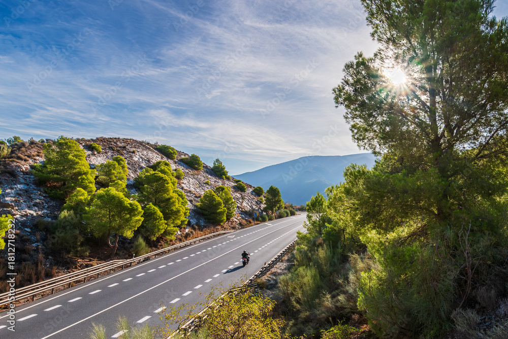 A motorcyclist riding along a solitary mountain road bordered by trees.