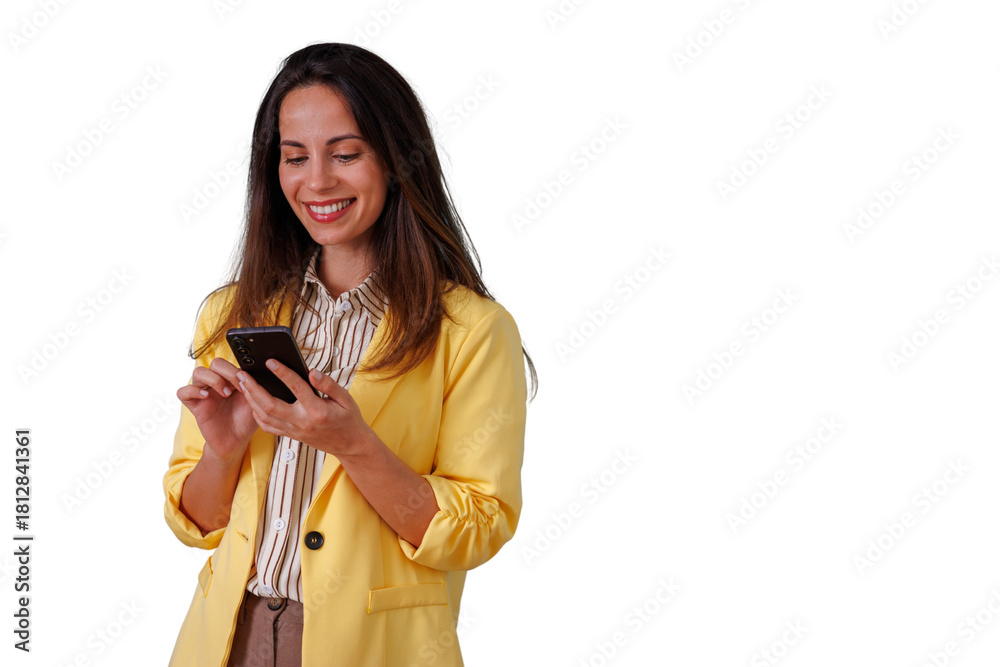 Woman smiling and texting on smartphone, communicating and networking online, transparent background