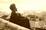 Lovely black curly girl is sitting on the roof of coastal town wrapped up in a rug on a sunny day and enjoying smoking electronic cigarette; faded cityscape with river, port and houses in background