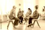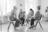 Group of elderly seniors sitting in a circle in nursing home with friendly young nurse and listening each other during psychological therapy in session. Psychotherapy for senior people.