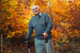 Happy senior man with a walking disability enjoying a walk in an autumn park pushing her walker or wheel chair.