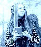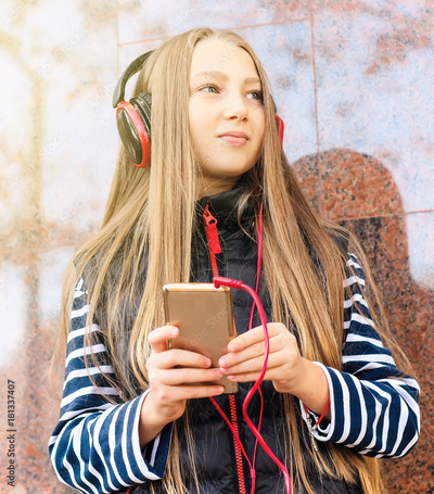 Portrait of a teenage girl with headphones and a paper smile and making a face, against a green background