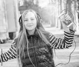 Funny girl with headphones jumping fun. Young beautiful girl listening to an mp3 player