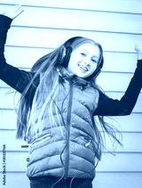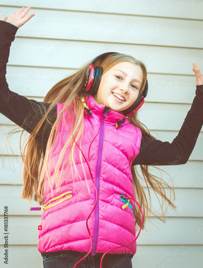 Funny girl with headphones jumping fun. Young beautiful girl listening to an mp3 player