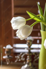 candlestick and bouquet of white tulips on the table. in the office. Selective focus