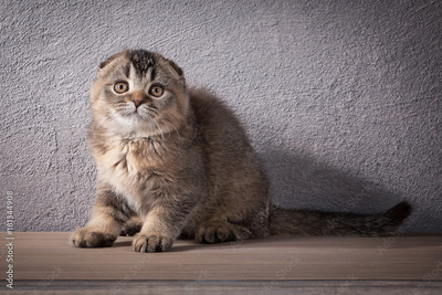 Cat. Scottish fold kitten on wooden table and textured background