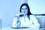 Portrait professional woman sitting at desk in front of whiteboard