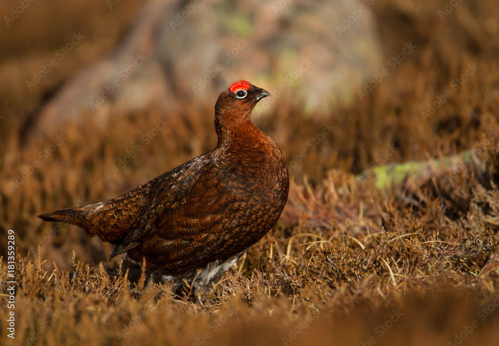 Male Red Grouse Lagopus lagopus scotica in heather moorland, Scotland