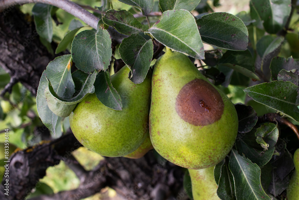 Pears on a branch close-up. Organic Fruits. Fruit disease, rot has formed on one pear.